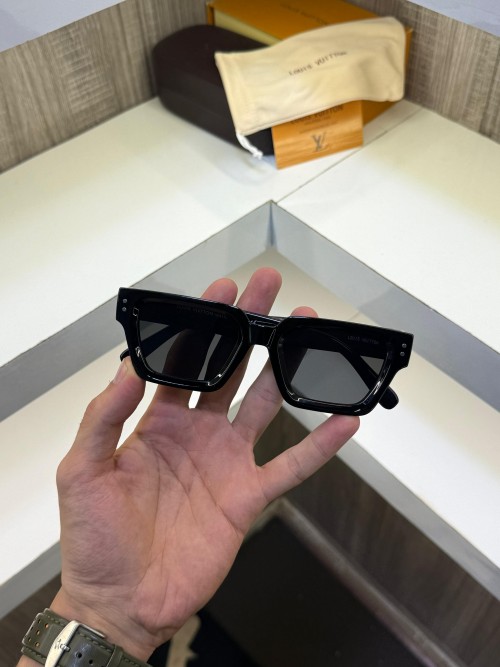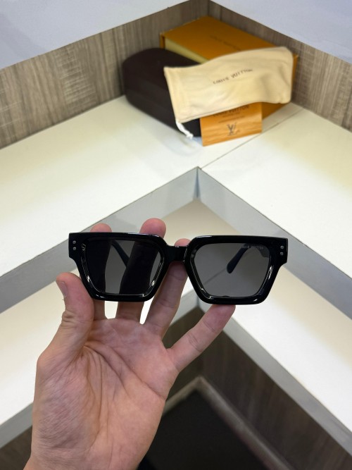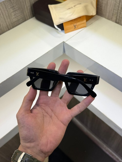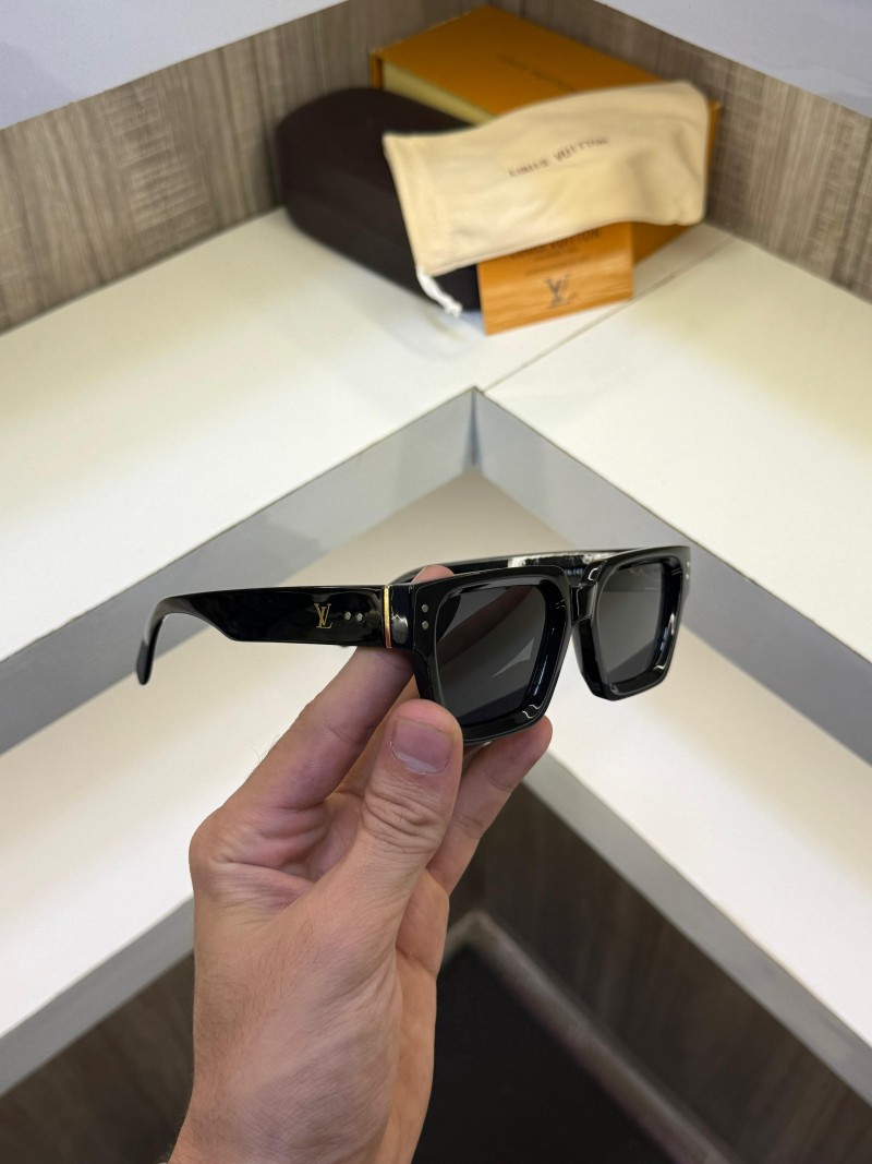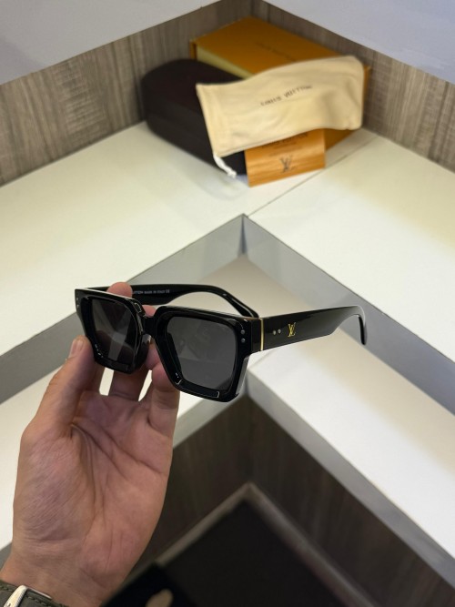 * Black acetate frame * Black lenses * Gold-color hardware * Square shape * Beveled front Hinged * Monogram pattern engraving along bridge * 'V" signature on bridge * LV Initials on hinges * Louis Vuitton signature on lens * Transmittance:14% * UV Protection:100% Filter Category:3